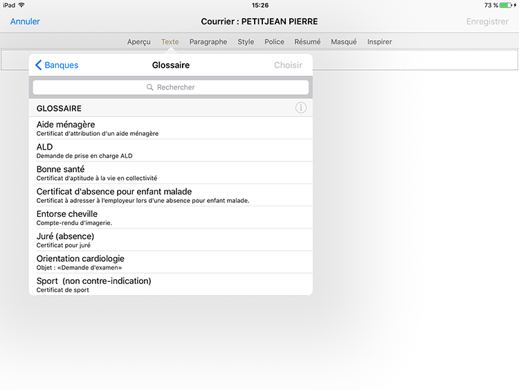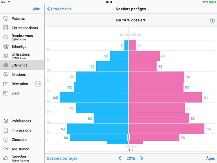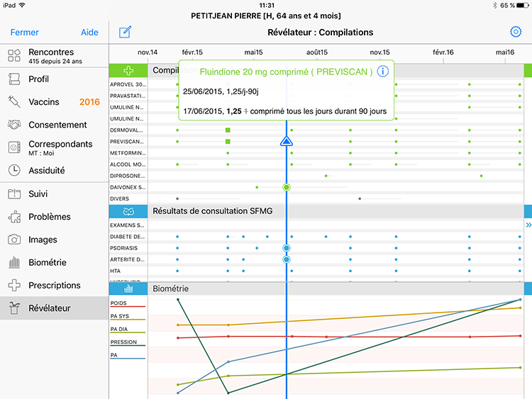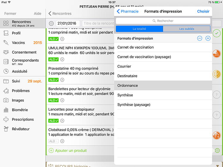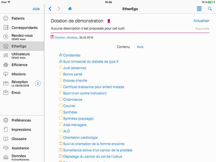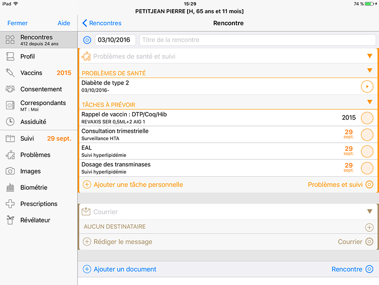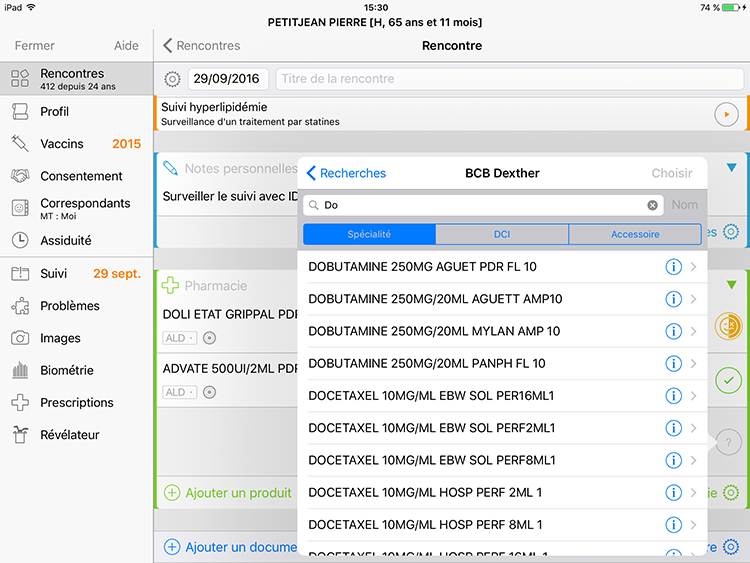 Ouvrez un dossier et l’essentiel vous saute aux yeux. Le calendrier de suivi déroule programmes de prévention et prises en charge choisis sur EtherEgo. Vous y trouverez aussi outils et formulaires pour consigner vos consultations. Prescrivez en toute sécurité avec la BCB-Dexther intégrée. Rédigez, modèles à l’appui. N’hésitez pas à correspondre par messagerie. Prenez de la hauteur sur votre patientèle, découvrez sa typologie, mesurez l’efficience du cabinet et obtenez vos indicateurs.